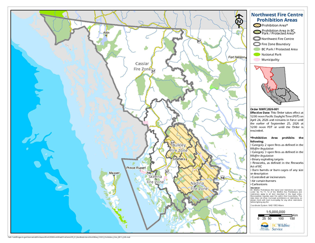 Effective 12:00 pm (noon) on Friday, April 24, 2026, a Category 2 and Category 3 open fire prohibition is in effect across the Bulkley and Nadina Fire Zones, including the Nadina Forest District and the Skeena portion of the Skeena Stikine Forest District.